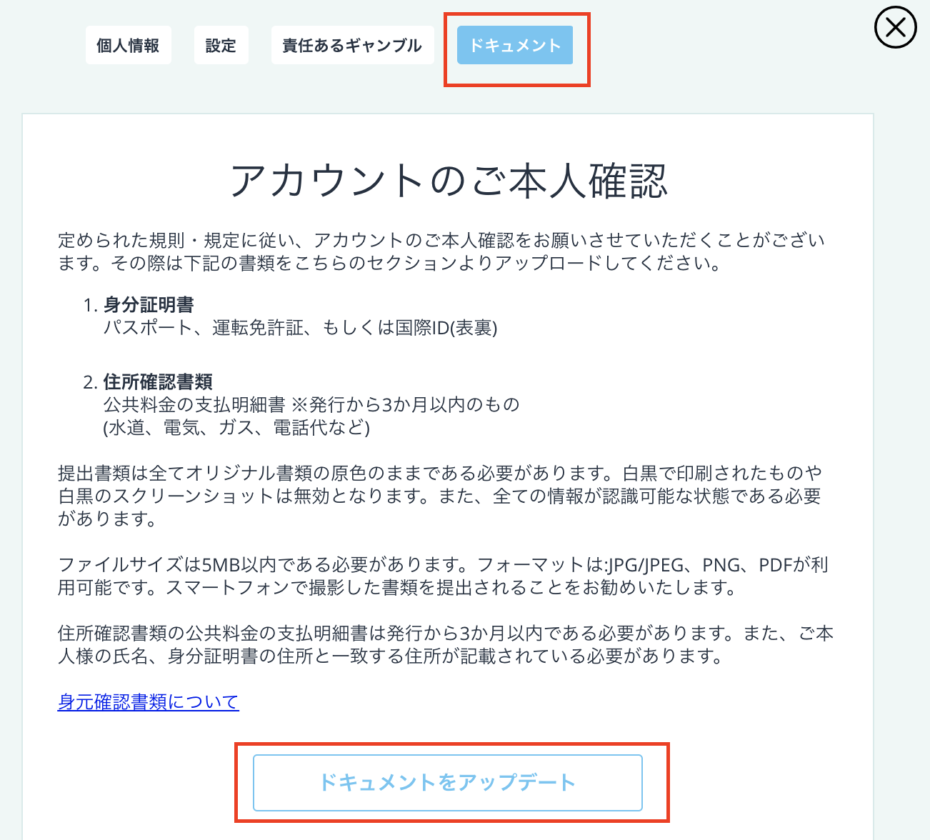 ・ファイルサイズは5MB以内である必要があります。フォーマットは:JPG/JPEG、PNG、PDFが利用可能です。スマートフォンで撮影した書類を提出されることをお勧めいたします。
